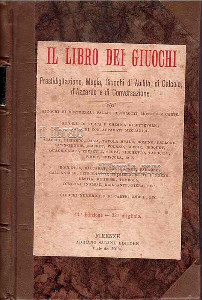 in 16°; pp. 496 (ill. in bn.); leg. in mezza pelle. Giuochi di destrezza: palle, bussolotti, monete e carte. Giuochi di fisica e chimica dilettevole; giuochi con apparati meccanici. Scacchi, biliardo, dama, tavola reale, domino, pallone, lawn - tennis, cricket, volano, boccie, croquet, quadrigliati, tresette, scopa, picchetto, tarocchi, whist, briscola ecc. Roulette, baccarat, lansquenet, faraone, campanello, pitocchetto, primiera, sette e mezzo, bestia, biribissi, tombola, tombola inglese, brillante, fiera, ecc. Giuochi numerici e di carte; ombre ecc.