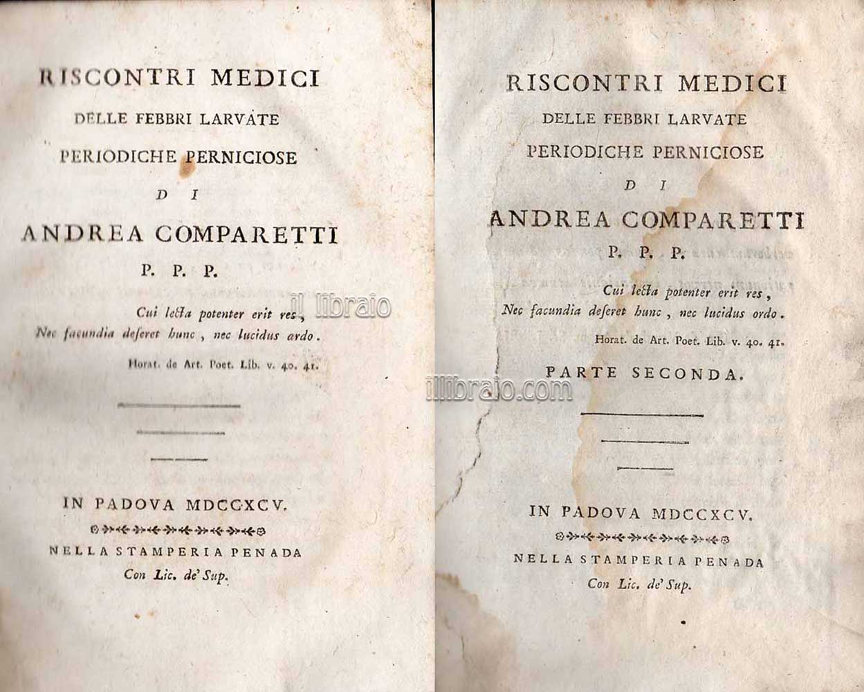 2 voll.; in 8°; pp. LXXXVIII, 736 compl.; leg. in mezza pelle con titoli e fregi in oro ai dorsi; fregio al colophon; 1^ ed. Rara opera che rese celebre Andrea Comparetti (Vicinale di Buttrio-Udine 1745-Padova 1801), famoso medico ed insegnante dell'universita patavina, morto della stessa malattia che studiò con tanta attenzione. Una sua lapide sepolcrale sta nella chiesa di S. Sofia in Padova. -... con il Comparetti a Padova la clinica migliorò nettamente i suoi standards: egli impostò programmi individuali per ogni paziente, con schede in cui, alla storia medica personale, si univano dati sulle terapie praticate, l'alimentazione e le connessioni climatiche dello stato morboso, prefigurando l'analisi chimica delle secrezioni e dell'aria degli ambienti dell'ospedale; propose anche che per l'esercizio della medicina fosse richiesto un triennio di pratica ospedaliera dopo il quadriennio di laurea. A queste posizioni evolute nella prassi clinica corrisponde il maggior pregio degli scritti medici, e particolarmente del più noto, i "Riscontri medici delle febbri larvate periodiche perniciose"... - (cfr. Dizionario Biografico Treccani)