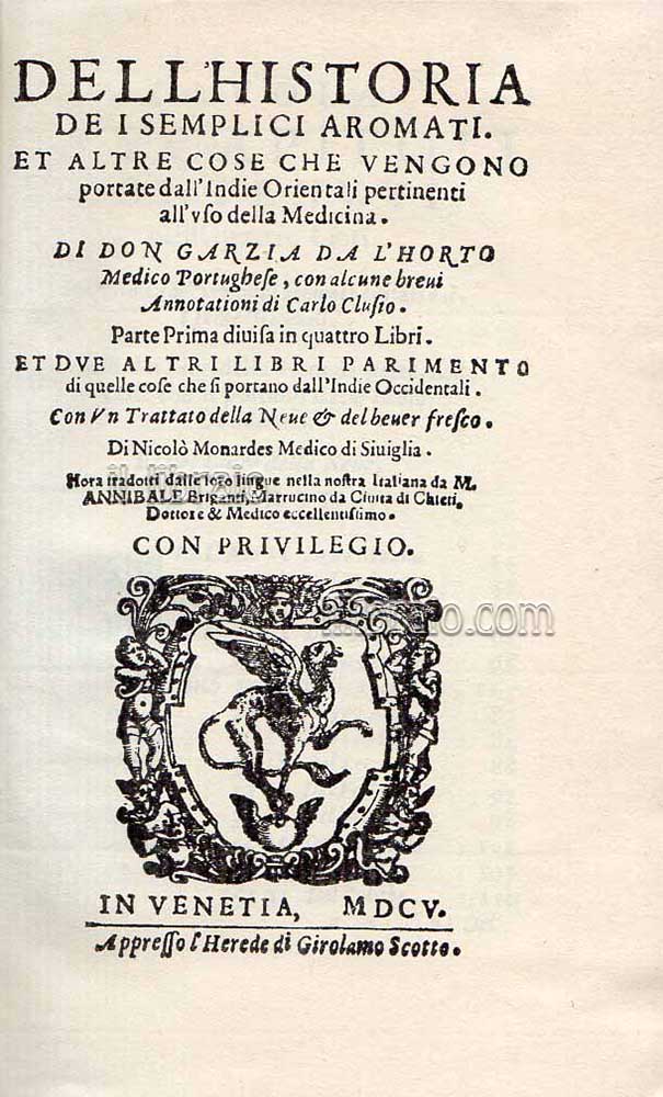 Dell'historia de i semplici aromati, et altre cose che vengono portate dall'Indie Orientali pertinenti al'uso della Medicina