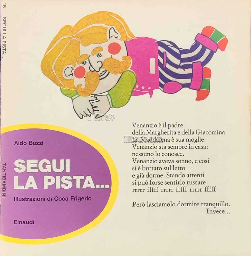 in 8°; pp. 32 compresa la copertina, (ill. a col.); br. spillata; coll. Tantibambini, # 15 Illustrazioni di Coca Frigerio. Questo libro fa parte della meravigliosa collana Tantibambini diretta da Bruno Munari. Il lettore può combinare le storie che più gli piacciono mettendo ogni volta in ordine diverso i personaggi, le cose, gli ambienti che trova nelle pagine di questo libro. Cambia la pista...cambia la storia