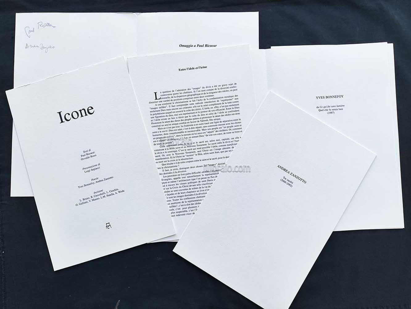 in folio; pp. 36 + 7 tavv. (ill. in bn.); br. con astuccio. Testo italiano - francese. Tiratura di 90 esemplari numerati (ns. 40) *esemplare con autografi di Ricoeur e Zanzotto. Opera in omaggio al filosofo francese Paul Ricoeur per iniziativa dell'ABAV (Accademia di Belle Arti Lorenzo da Viterbo) e con il patrocinio della Camera dei Deputati. La cartella raccoglie fogli sciolti ed è composta da testi dello stesso Paul Ricoeur e Osvaldo Rossi. Presentazione di Luigi Sepiacci. Poesie Yves Bonnefoy (Quel che fu senza luce - 1987) e Andrea Zanzotto (Tre inediti 2000 - 2002). Inoltre contiene 7 incisioni di: L. Bruno, B. Ceccobelli, L. Ceschin, O. Galliani, V. Manno. L. M. Patella e A. Woda