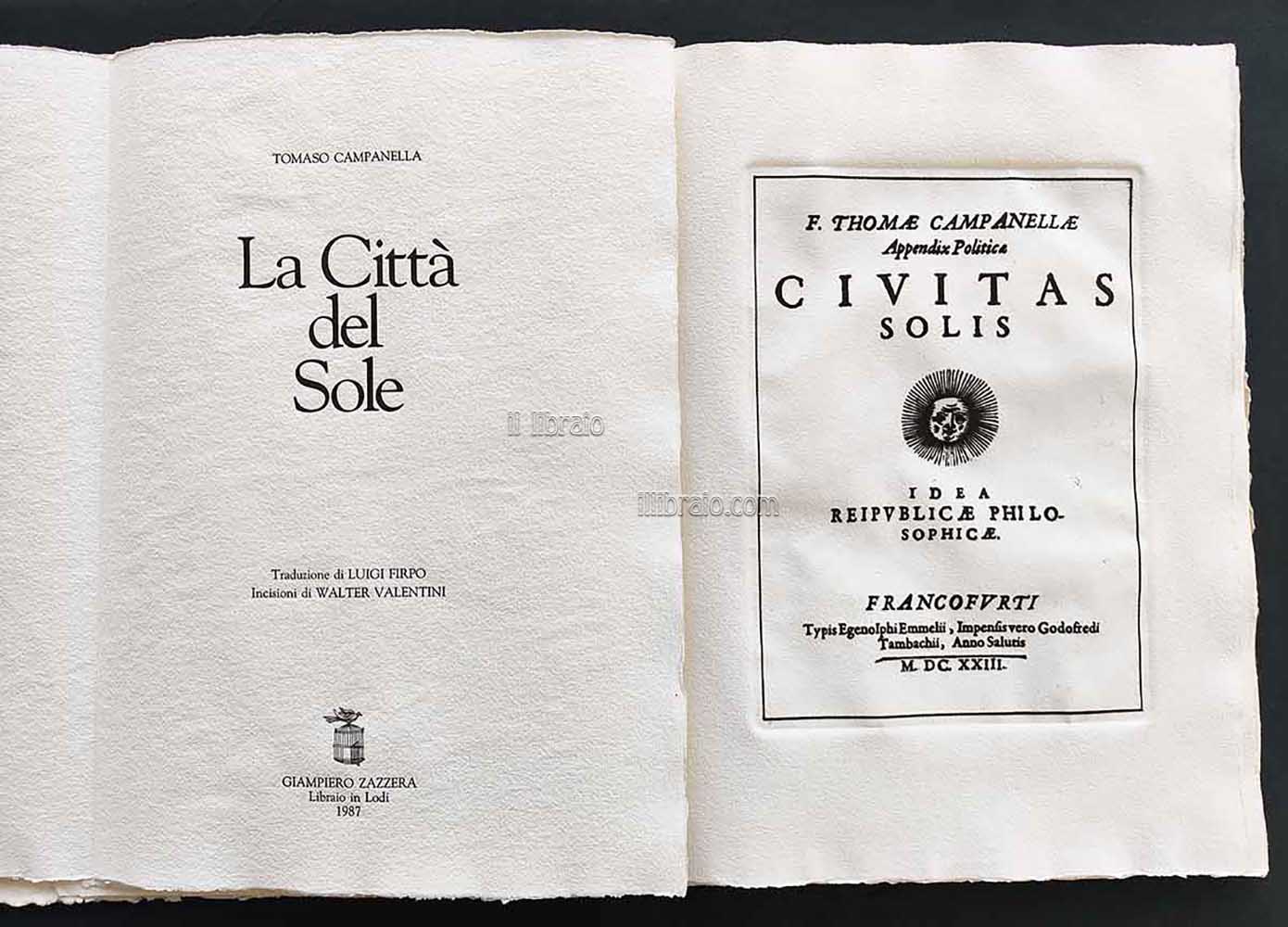 in 4° (39 x 29 cm. ca.); pp. (8), 32 + 1 tav. (ill. in bn. e col.); br. con astuccio. Traduzione di Luigi Firpo. Con 2 incisioni di Walter Valentini, una fuori testo e l'altra concepita come copertina del volume. Impaginazione di Walter Valentini. Le incisioni sono state impresse su torchio a mano da Giancarlo Sardella, su carta Duchene. I testi sono stati stampati dall'Istituto Grafico Bertieri di Milano. Colophon con numero della copia e firme a matita dell'editore e dell'illustratore. Opera in copertina non firmata; opera fuori testo con firma e numero a matita. Tiratura in 180 esemplari a fogli sciolti stampati su carta alcantara, firmati e numerati a matita dall’artista, da 1 a 90 in cifre arabe e da I a XC in cifre romane (ns. L). Il tutto raccolto in un'elegante custodia in plexiglas disegnata da P. Spallacci.