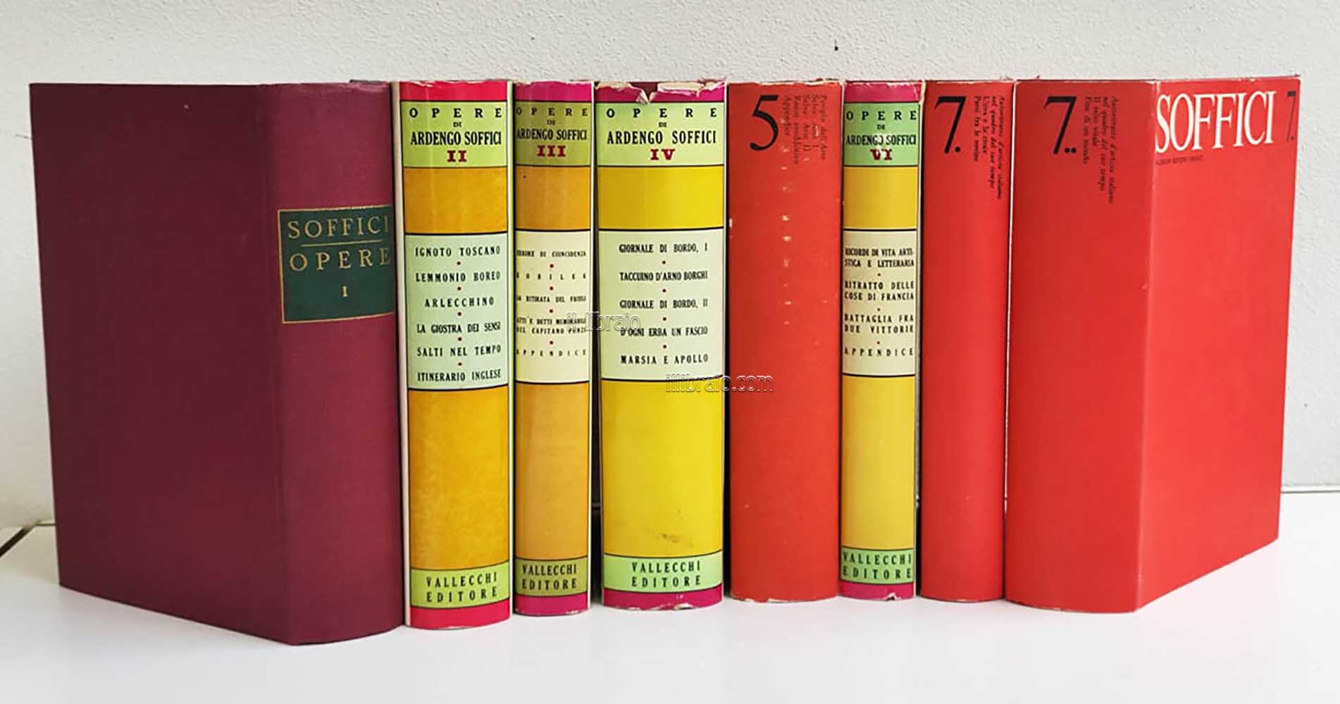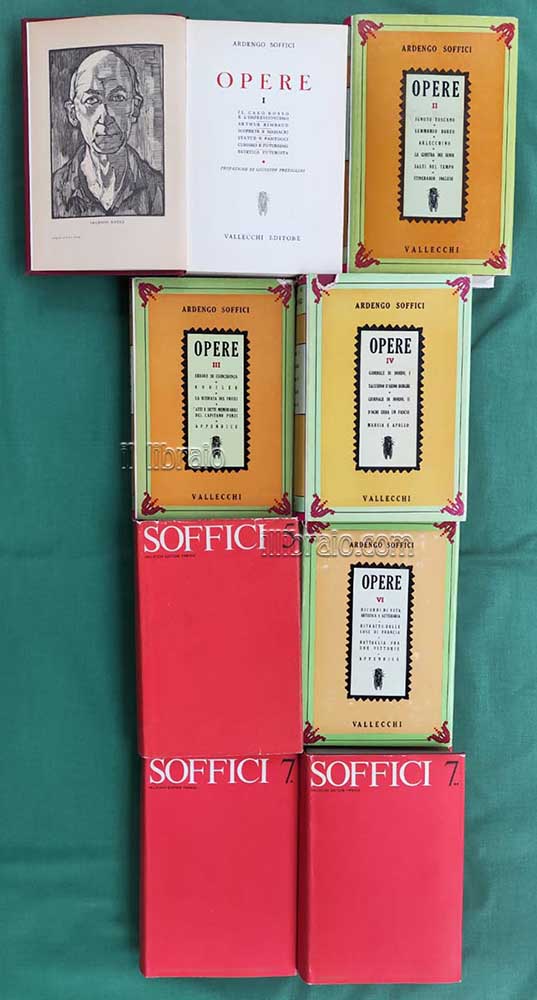 8 tomi in 7 voll.; in 8°; pp. LVIII, 754; 768; 476; 836; 712; 500; 508; 824 + 1 tav. (ill. in bn.); leg. con sovracop. (solo il 1° vol. manca della sovracop.) Al 1° vol. prefazione di Giuseppe Prezzolini e una riproduzione xilogr. di Pietro Parigi ritraente Ardengo Soffici. Monumentale opera di tutti gli scritti del noto scrittore e pittore toscano. L'opera si compone: Vol. 1: Il caso Rosso e l’impressionismo; Arthur Rimbaud; Scoperte e massacri; Statue e fantocci; Cubismo e futurismo; Estetica futurista - Vol. 2: Ignoto toscano; Lemmonio Boreo; Arlecchino; La giostra dei sensi; Salti nel tempo; Itinerario inglese - Vol. 3: Errore di coincidenza; Kobilek; La ritirata del Friuli; Atti e detti memorabili del Capitano Punzi; Appendice - Vol. 4: Giornale di bordo I; Taccuino d'Arno Borghi; Giornale di bordo II; D'ogni erba un fascio; Marsia e Apollo - Vol. 5: Periplo dell'arte; Selva: arte I e II; Rosso aneddotico; Appendice - Vol. 6: Ricordi di vita artistica e letteraria; Ritratto delle cose di Francia; Battaglia fra due vittorie; Appendice - Vol. 7*: Autoritratto d'artista italiano nel quadro del suo tempo; L'uva e la croce; Passi fra le rovine - Vol. 7**: Il salto vitale; Fine di un mondo. (Condizioni generali molto buone. Completo di tutte le sovracop. originali - tranne il 1° vol. che n'è sprovvisto - con piccole imperfezioni. Internamente: normale leggerissimo ingiallimento delle pagine ma totale assenza di segni o scritte)